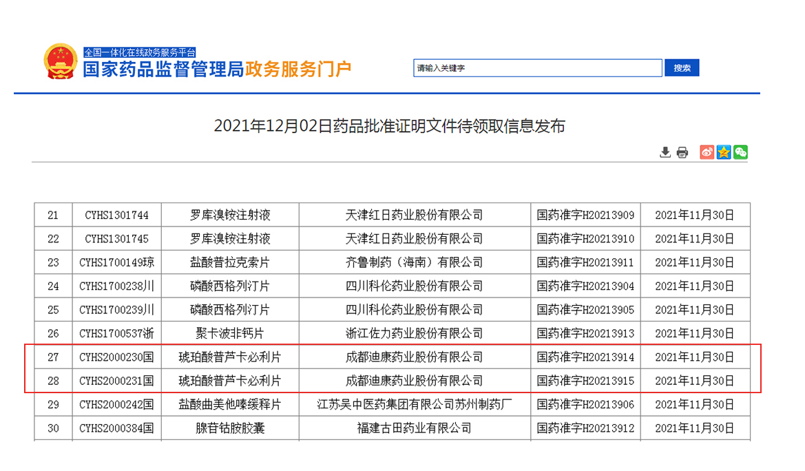 近日,國家藥品監督管理局正式發布通知,華威醫藥受成都迪康藥業股份有限公司委托的琥珀酸普蘆卡必利片(1mg、2mg)項目正式通過審評審批,獲得生產批件。