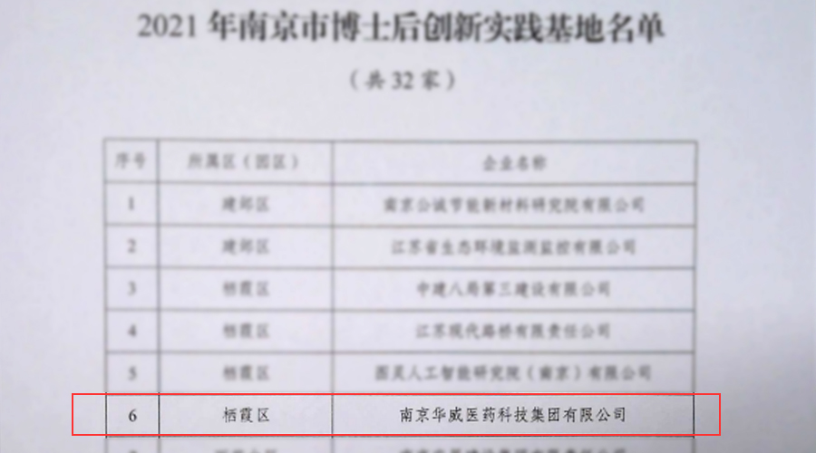 近日,經南京市人力資源和社會保障局批準(寧人社[2021]123號),確定南京華威醫藥科技集團有限公司在內的32家單位獲準設立南京市博士后創新實踐基地。