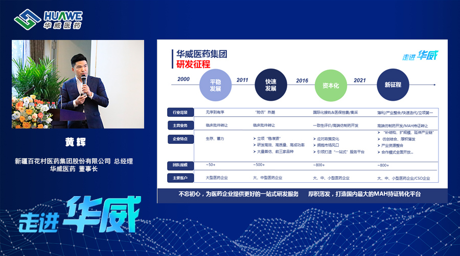 11月8日,華威醫(yī)藥聯(lián)合前途匯隆重舉行“走進(jìn)華威,邀您共行”的研討開放日活動,邀請百名醫(yī)藥行業(yè)翹楚齊聚金陵、共話發(fā)展。新疆百花村醫(yī)藥集團(tuán)股份有限公司(股票代碼600721)總經(jīng)理、南京華威醫(yī)藥集團(tuán)董事長黃輝在大會上全面講述了華威醫(yī)藥的轉(zhuǎn)型發(fā)展之路,全方位介紹了華威醫(yī)藥集團(tuán)的研發(fā)部署、研發(fā)優(yōu)勢、項(xiàng)目經(jīng)驗(yàn)以及管理舉措等。