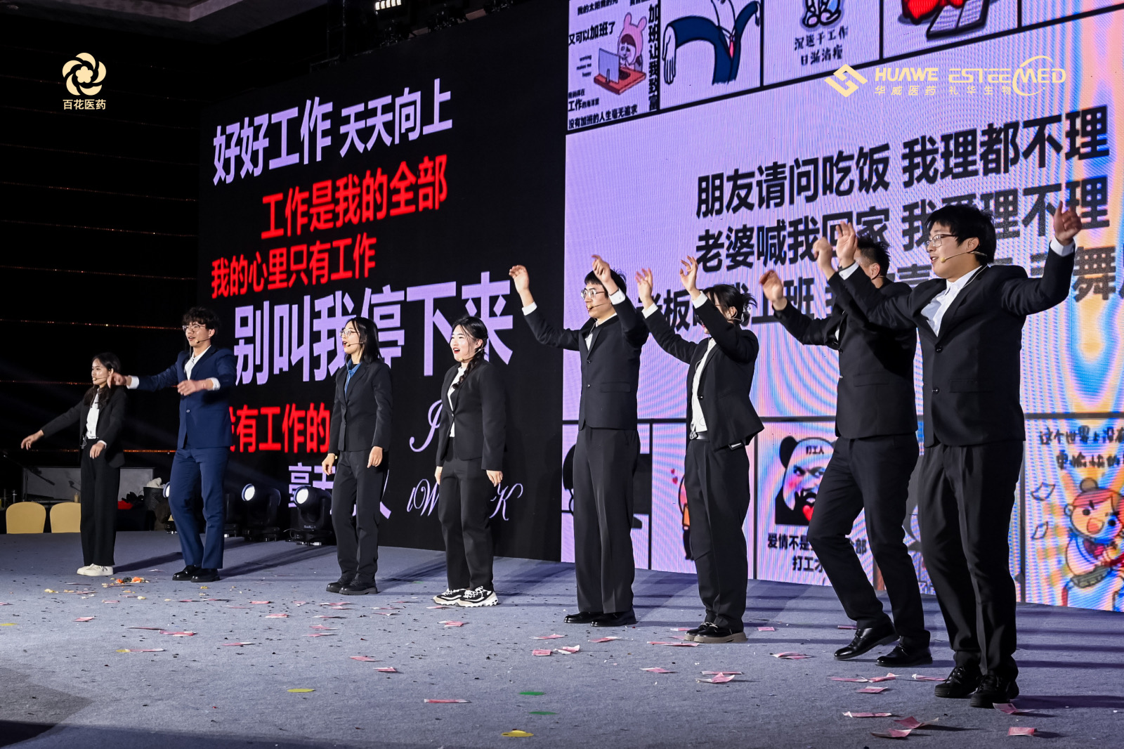讓人捧腹大笑、嗨翻全場的小品《艱難抉擇》、用最純粹的聲音詮釋對音樂的熱愛和執著的歌曲《華威好聲音》、全新“黑科技”升級的互聯網問診小品《體檢》、活力四射神采飛揚,展示青春活力和激情的舞蹈《Tell me》、寓意著人生旅程中不斷奮斗、不懈追求的歌舞《一路生花》、代表研發板塊藥研心聲的朗誦《我愛上班》、凝聚中華民族精神力量與審美意蘊的巾幗傳奇舞蹈《刀馬旦》、追求生活如同四季一般豐富多彩的歌舞《如愿》以及凸顯熱愛,不斷奮斗向前的歌曲大合唱《倔強》,更讓現場的氣氛達到頂峰。