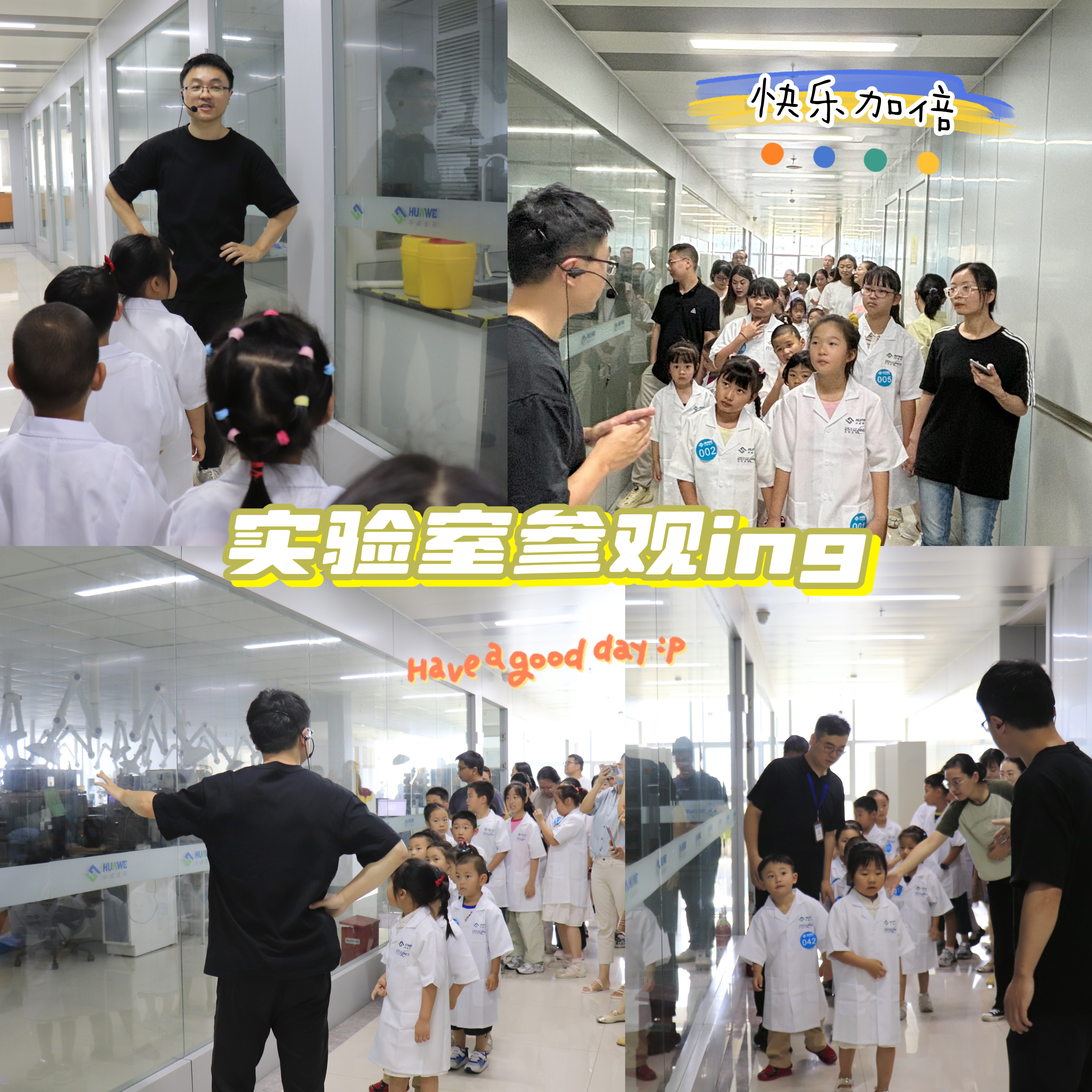 活動從探索華威醫藥的實驗室開始,孩子們首先通過公司宣傳片對爸爸媽媽們的工作環境和內容有了一個初步的了解,接著穿上迷你版的實驗服,變身小小科學家,跟隨著專業的講解員一起探索醫藥研發設備。